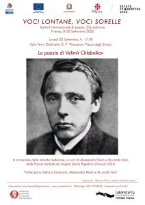 Velimir (Viktor) Chlebnikov (1885 – 1922) è uno dei protagonisti (anche se da noi meno conosciuto degli altri) della grande stagione poetica russa di inizio ‘900. Compie studi matematici e scientifici ma insieme si dedica alla poesia, avvicinandosi dapprima al gruppo simbolista e poi divenendo uno dei protagonisti del futurismo. Ricollegandosi da un lato alle forme letterarie russe arcaiche e dall’altro alle sperimentazioni cubo-futuriste egli crea testi di grandissima originalità.